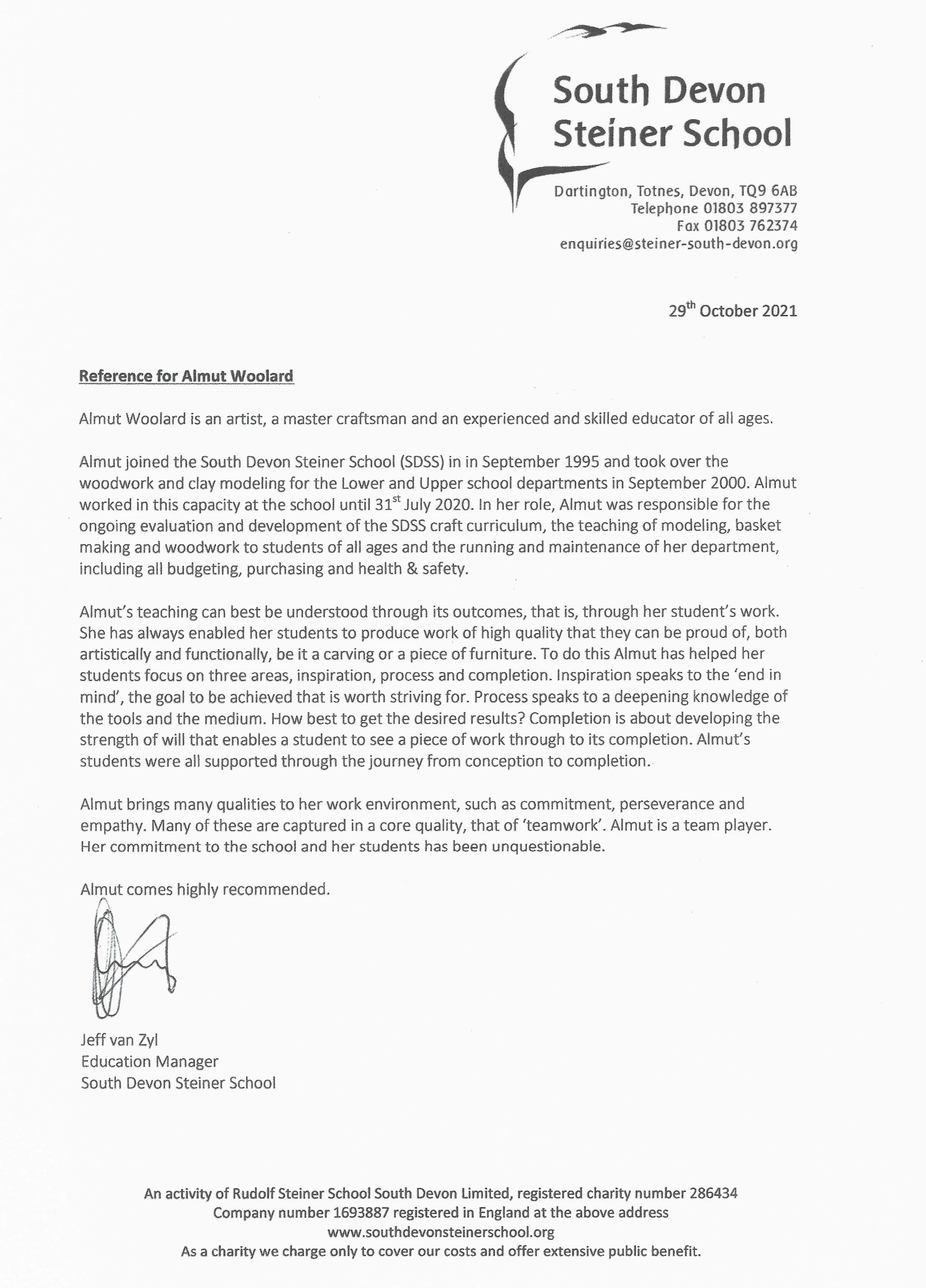 I’m very happy to recommend Almut Woolard as a teacher of Woodwork. I have worked with her during a teacher-training programme and was impressed by the enthusiasm and engagement she elicited from students during this course. It was common to find students working late in to the evening to finish off carving they had begun in her lessons. It was clear that her lessons were carefully prepared with close attention to detail and careful preparation of raw materials and tools. I have also observed and worked with her when she was teaching woodcraft at the South Devon Steiner School. Again, she was well-prepared and an excellent colleague, always ready to share and offer support.